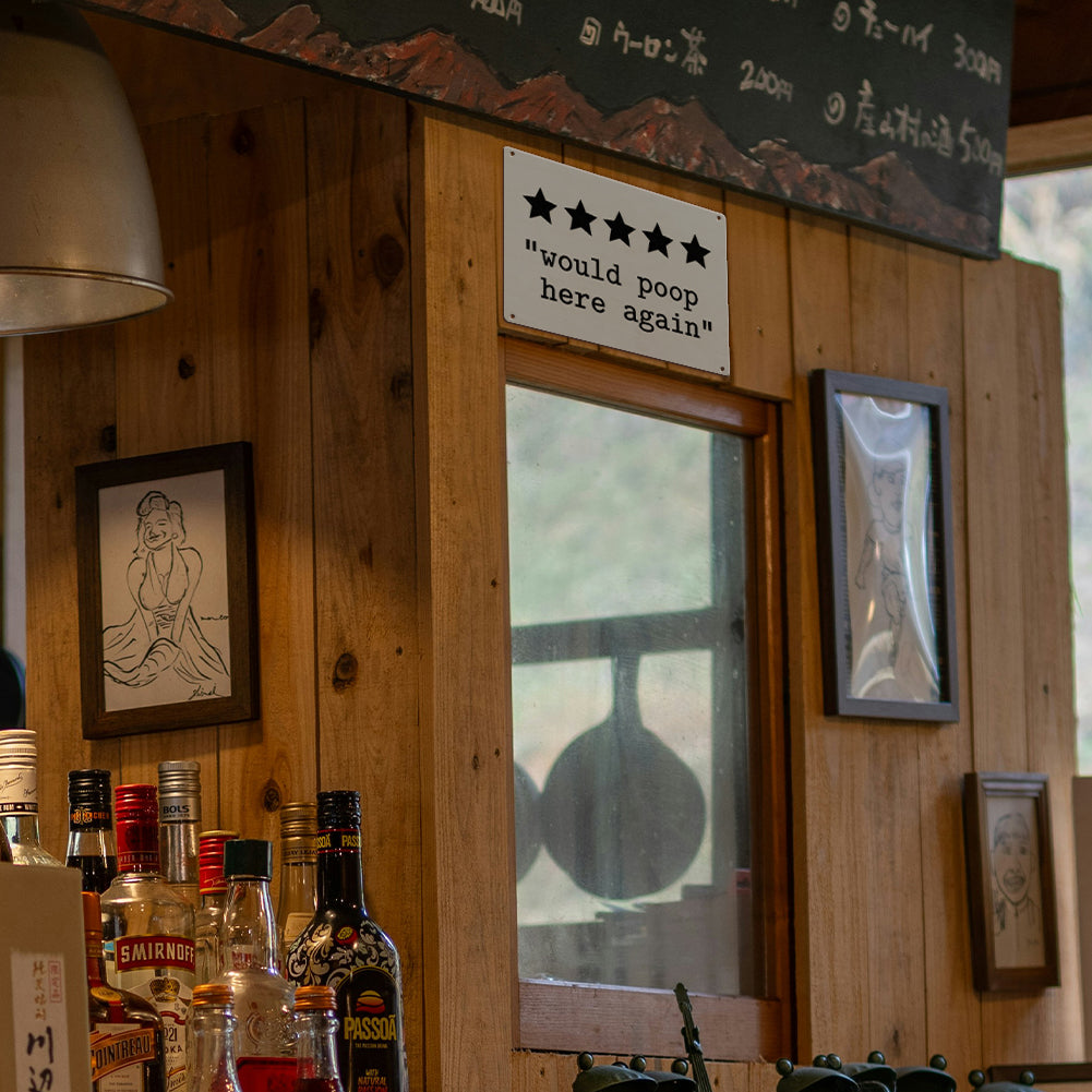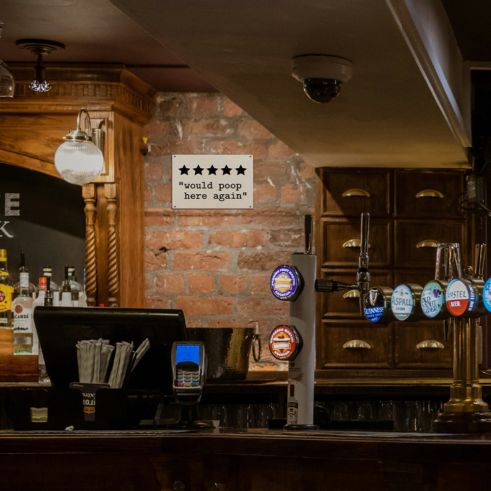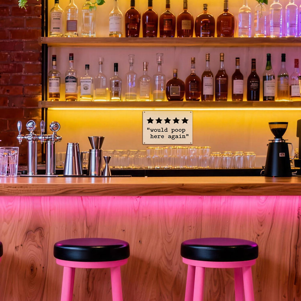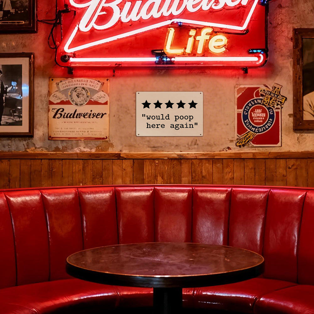 Turn your bathroom into a 5-star experience. This vintage-style metal sign features a hilarious review-style design that reads “Would poop here again,” inspired by online ratings and review culture.