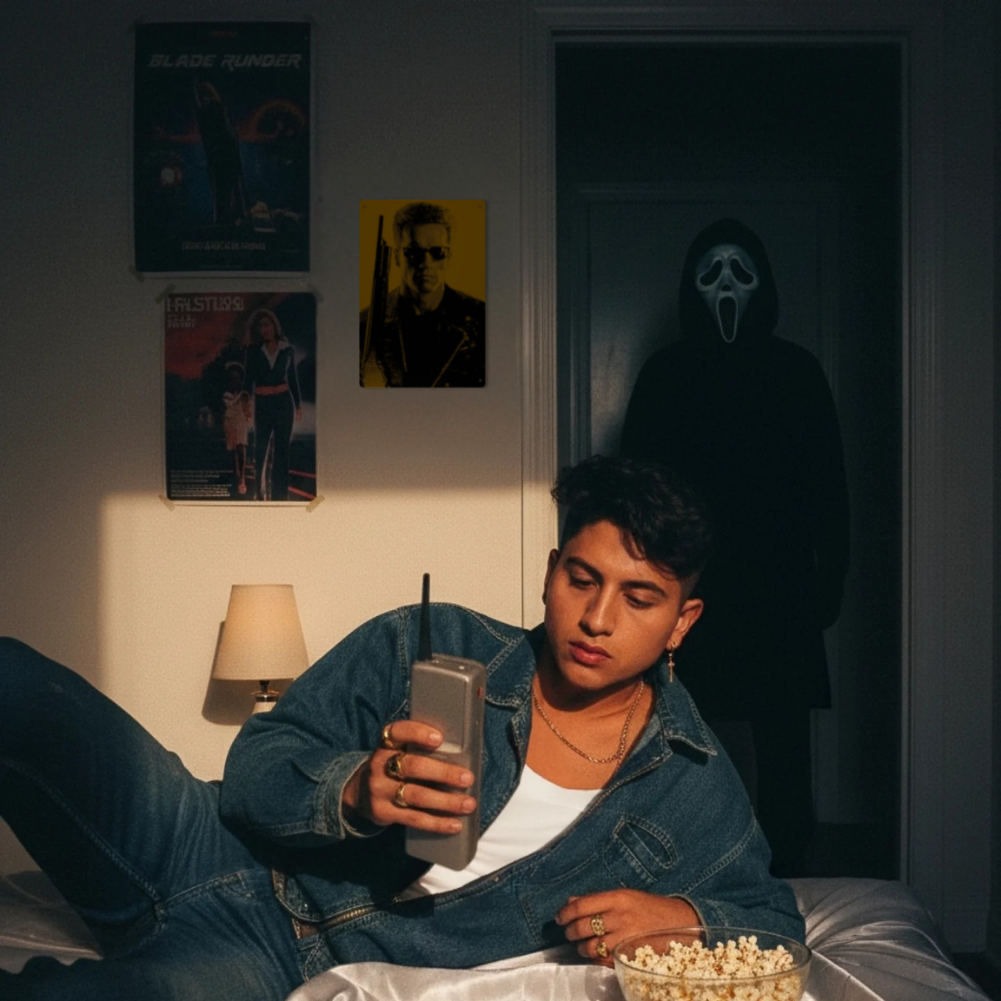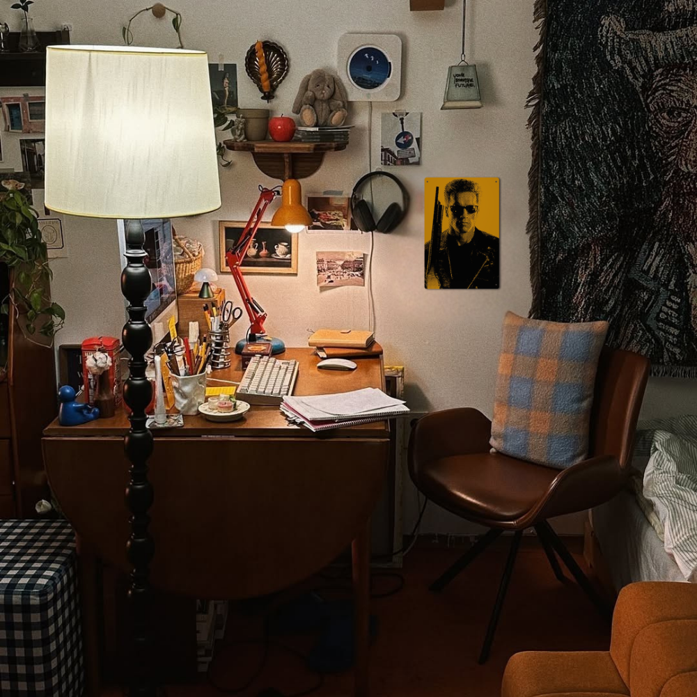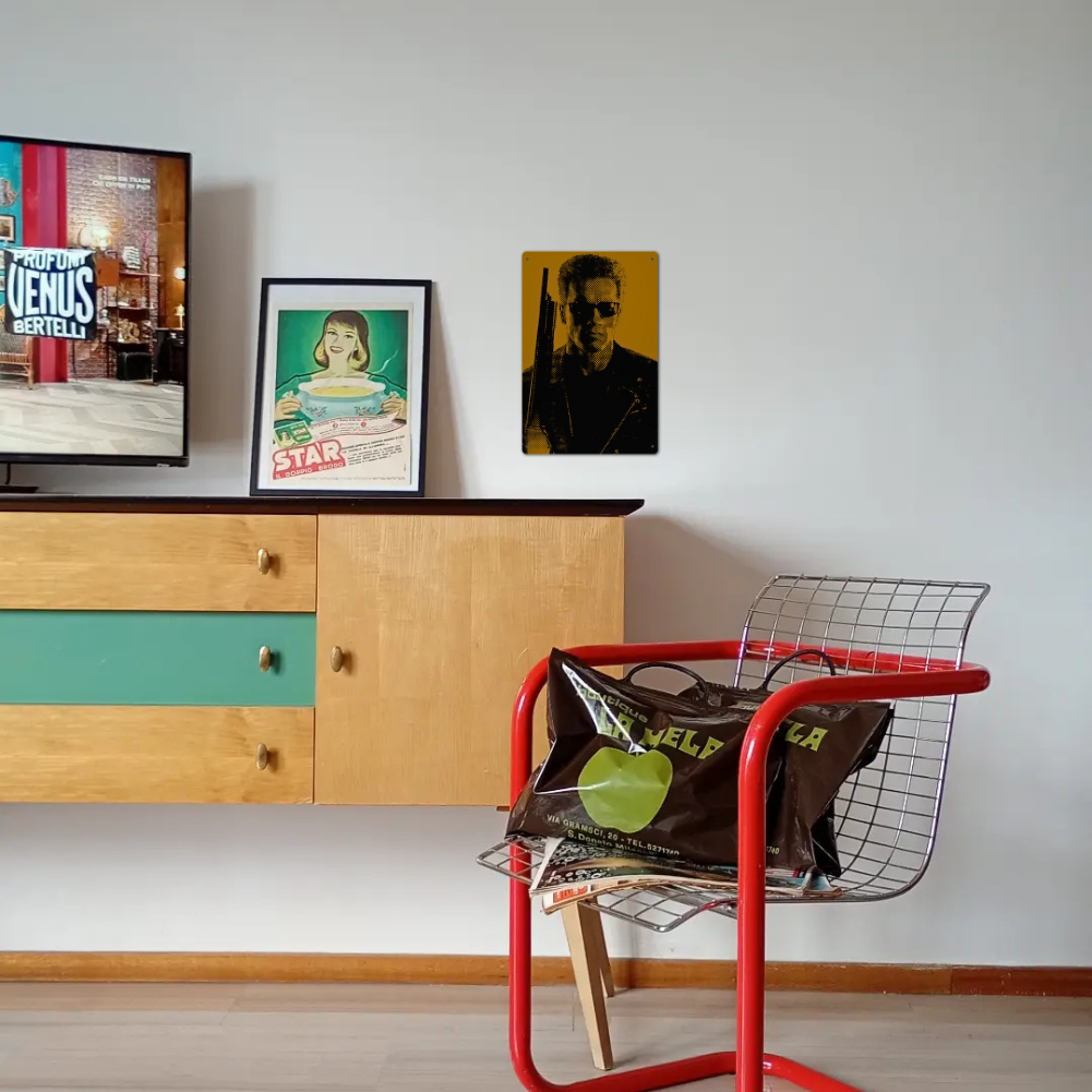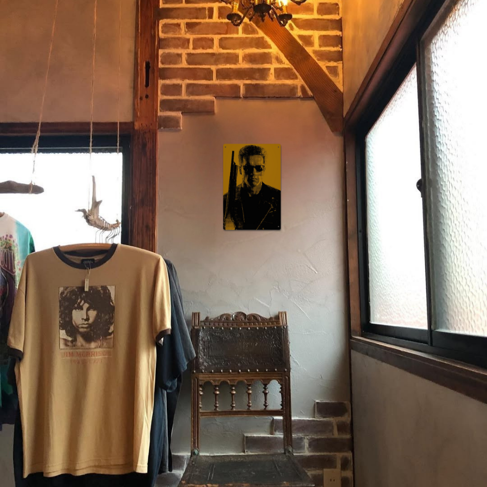 Turn up the tough-guy vibe. This vintage-style metal tin sign features a bold halftone portrait of Arnold—shades, leather, and a side profile of his shotgun—set against a deep mustard field. Printed to look worn-in and ready to hang in a garage, game room, or home theater.