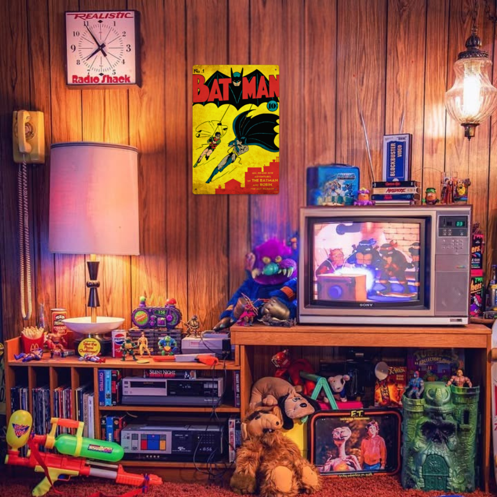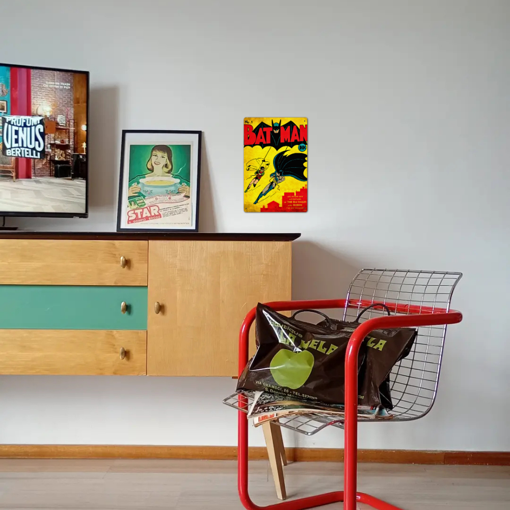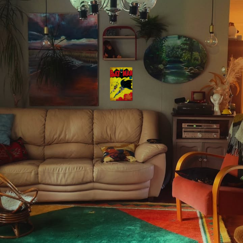 The issue that launched a legend. This premium print recreates the bold, canary-yellow cover of Batman #1 (Spring 1940), with Batman and Robin swinging through Gotham beneath the classic bat-wing masthead.