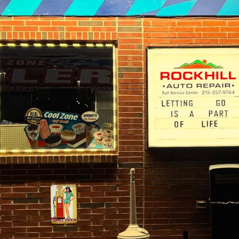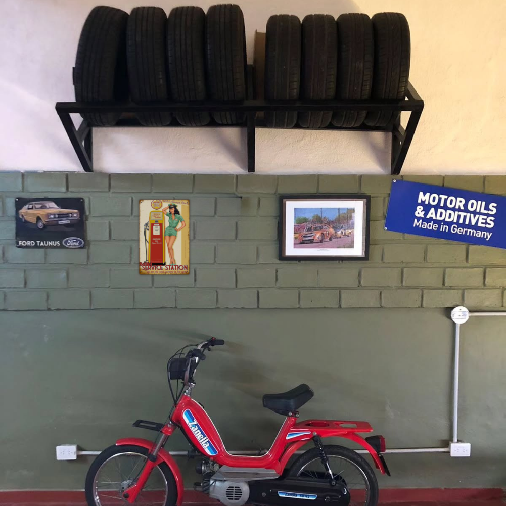 Fill up on vintage charm with this retro “Bettie’s Service Station” tin sign—classic pin-up art and an old-school gas pump, ready to fuel your décor.