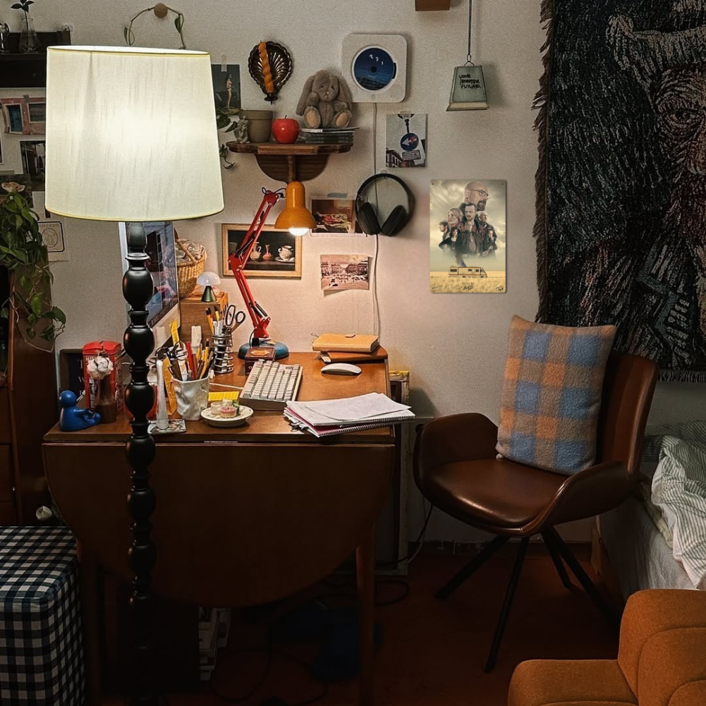 This vintage-style metal tin sign captures the tension of Breaking Bad: the lead characters loom over their iconic RV, smoke drifting into a stormy desert sky. Printed on durable tin with a lightly distressed finish, it’s perfect for a home theater, game room, office, dorm, or bar.
