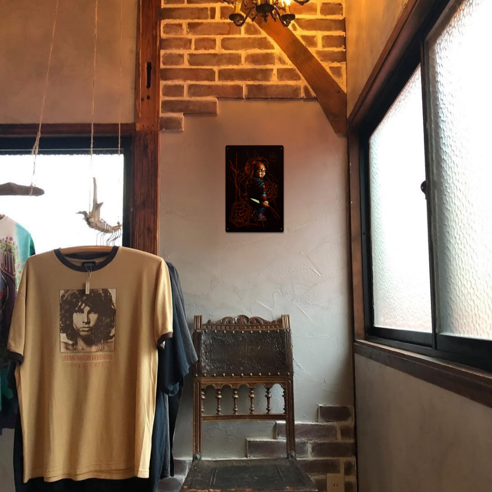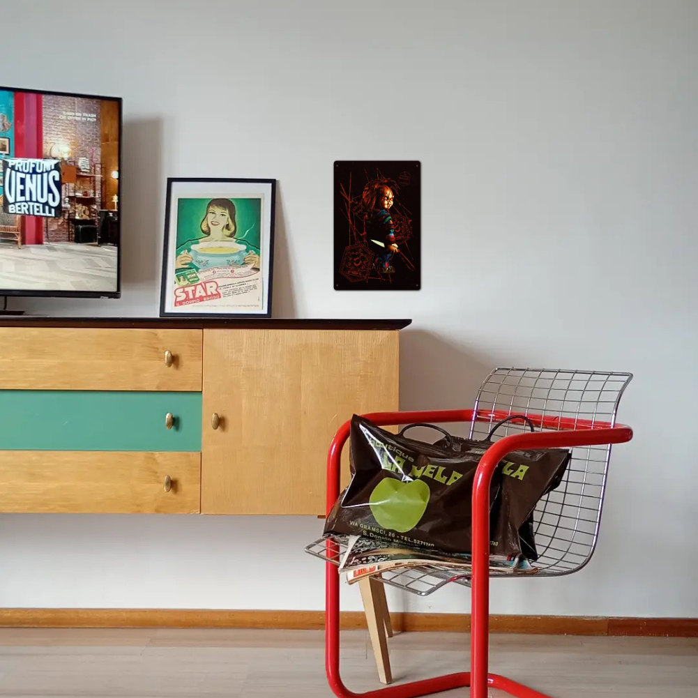 This retro tin sign features the cult-favorite slasher Chucky—knife in hand, lit by eerie red highlights against scratched sigils and a grunge backdrop. A bold statement piece for a game room, home theater, bar, or Halloween display.