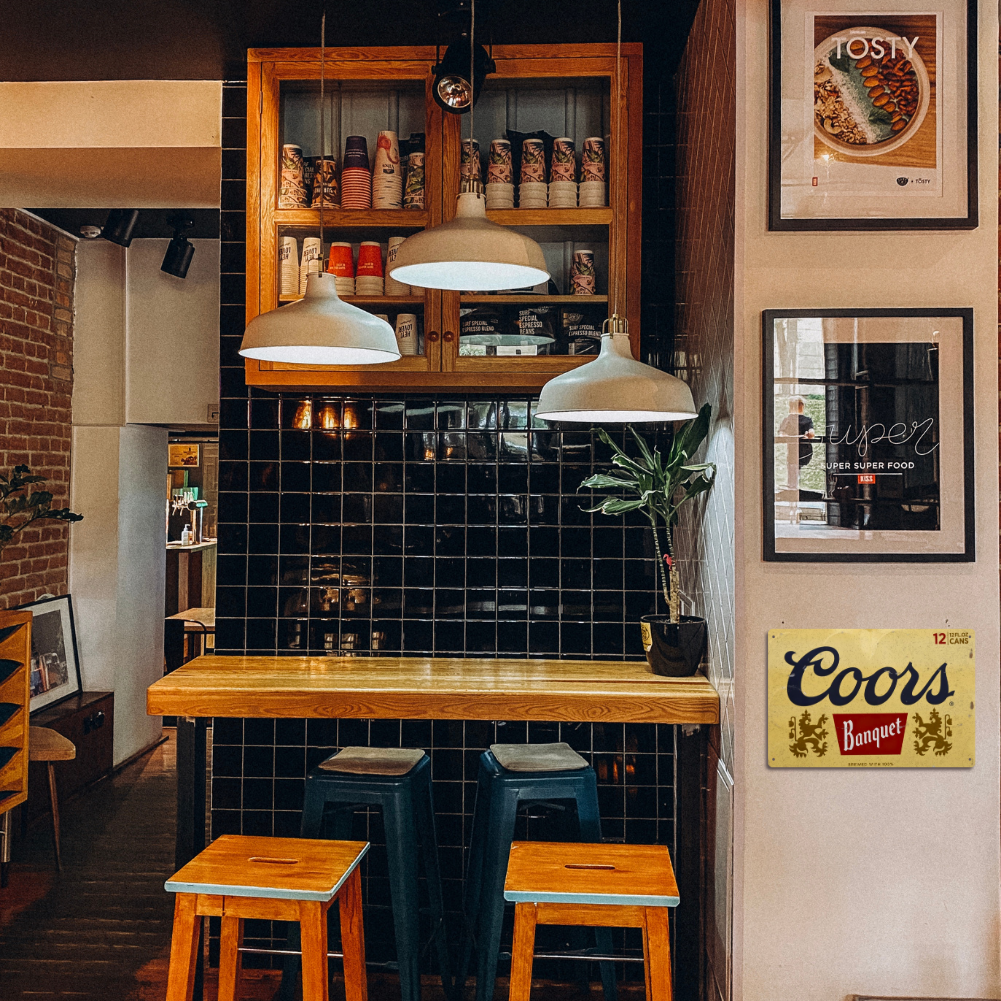 Bring classic brewery style to your space with this vintage-inspired Coors Banquet metal sign. The iconic cream label, navy script, and twin lions make an instant statement on any wall.