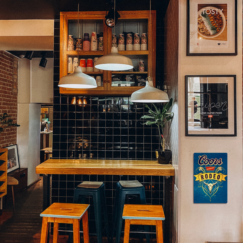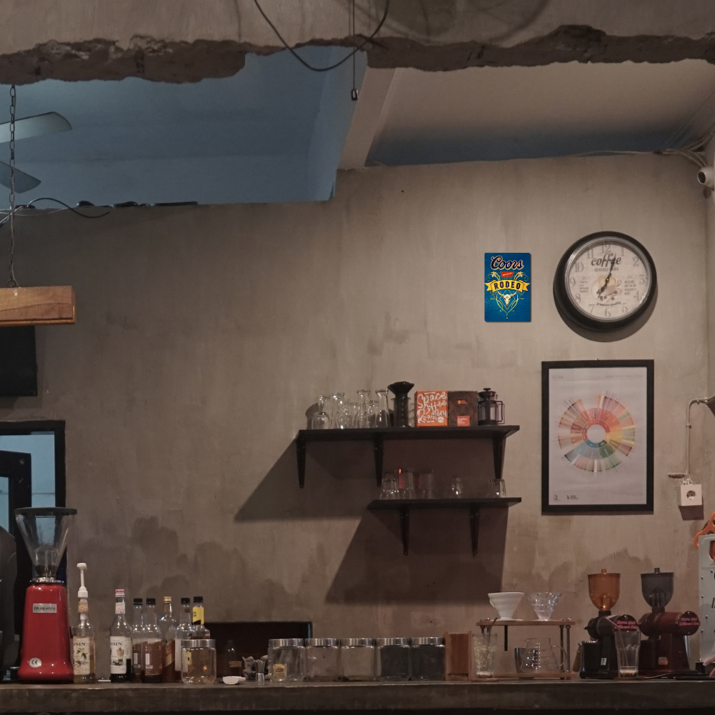 Bring Western bar-room charm to your space with this vintage-inspired Coors Rodeo metal sign featuring the classic “Banquet Beer” crest, bold RODEO banner, and longhorn skull motif on a weathered blue background.
