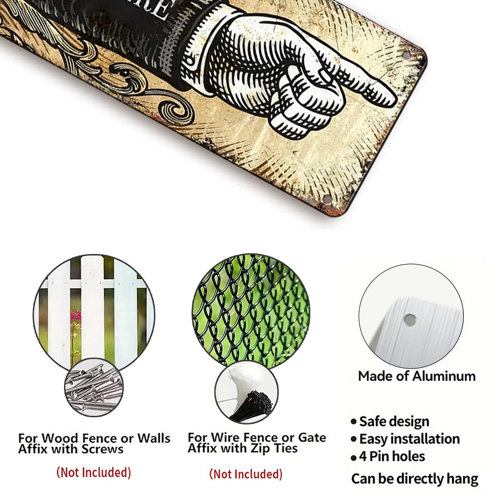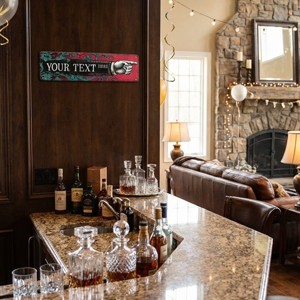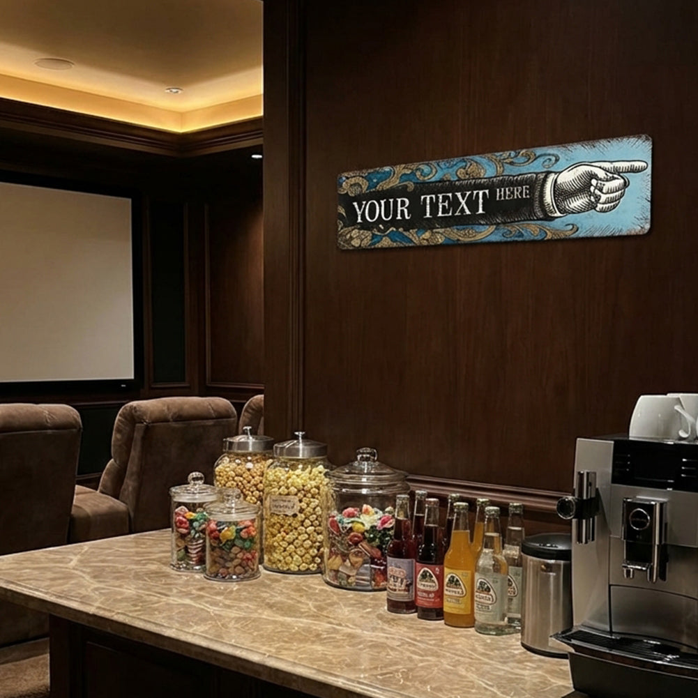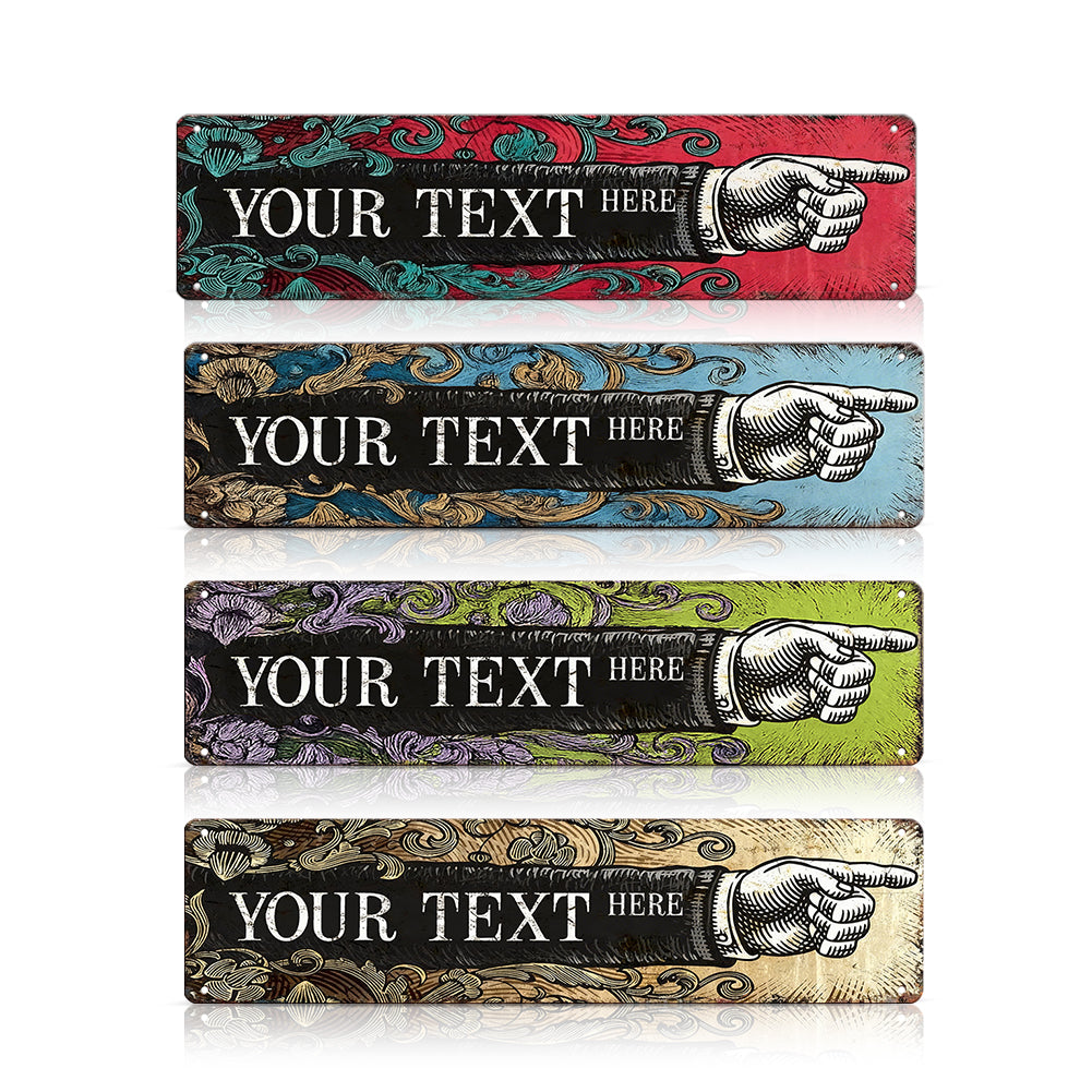 Point the way with vintage style. This custom metal sign features a classic Victorian pointing hand illustration pointing to the right, combined with ornate retro patterns and bold typography.