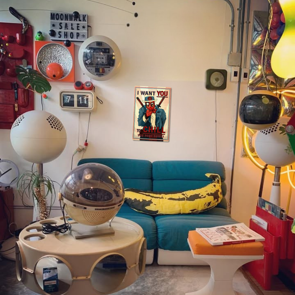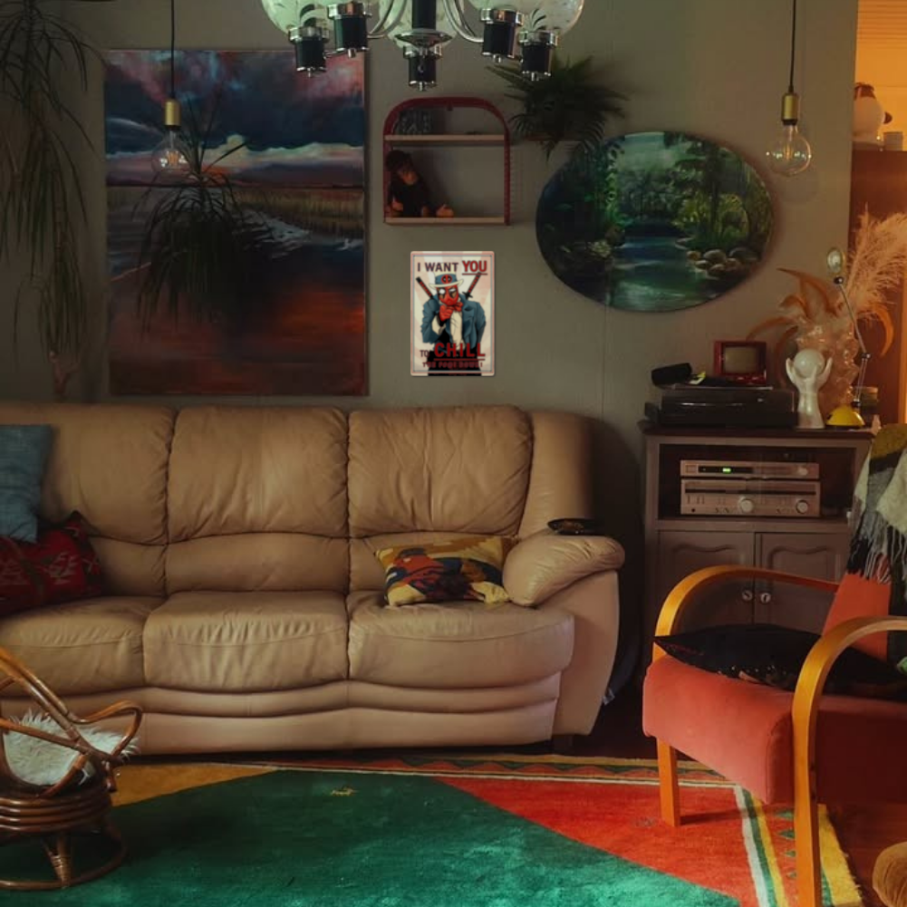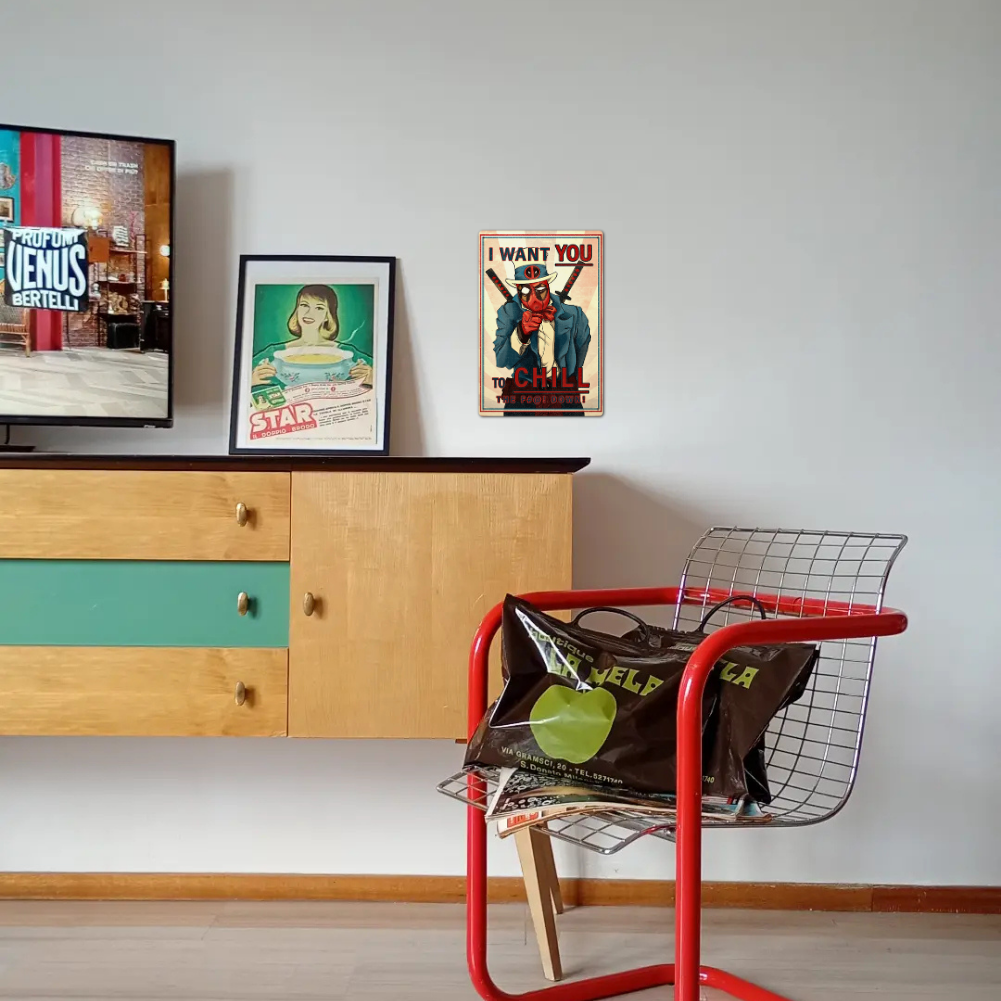 Maximum sarcasm, vintage vibes. This parody print reimagines everyone’s favorite fourth-wall breaker as Uncle Sam, complete with top hat and dual katanas, urging you to CHILL. A distressed, retro color palette and halftone texture give it that well-loved poster feel—perfect for game rooms, studios, and comic caves.
