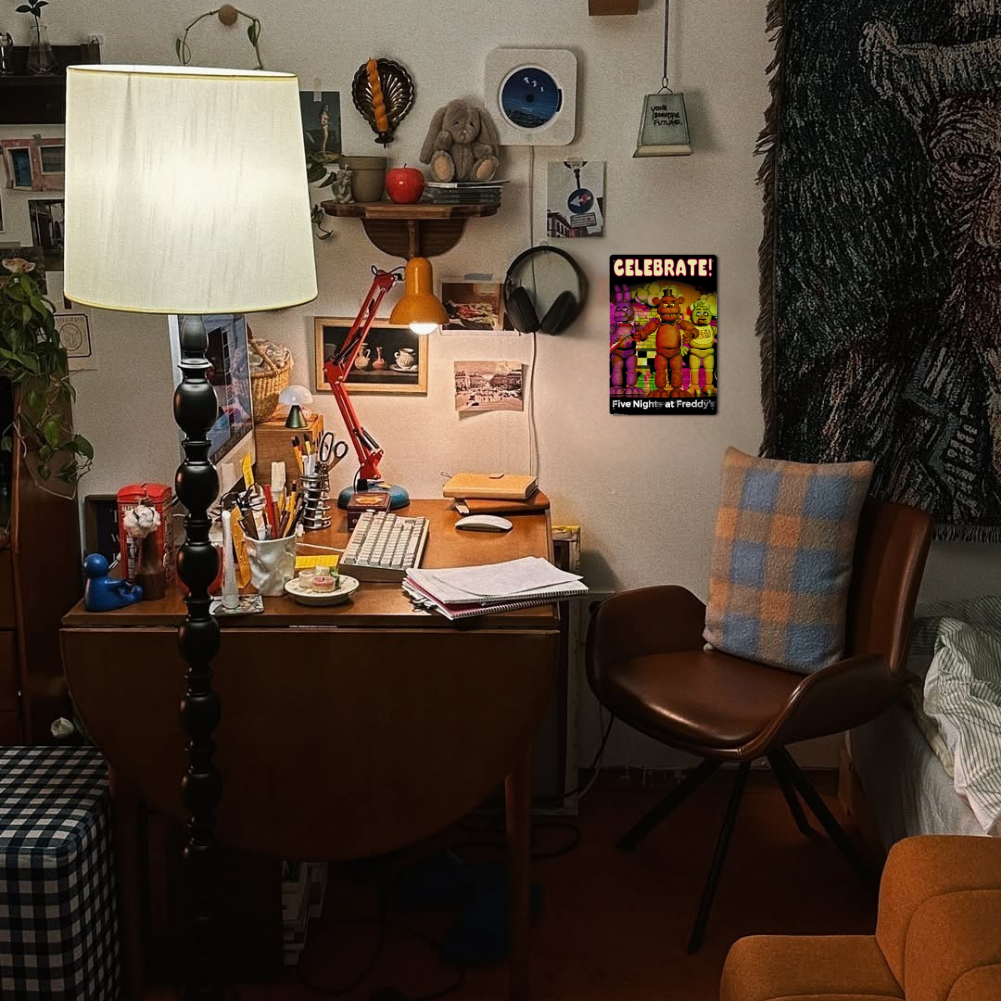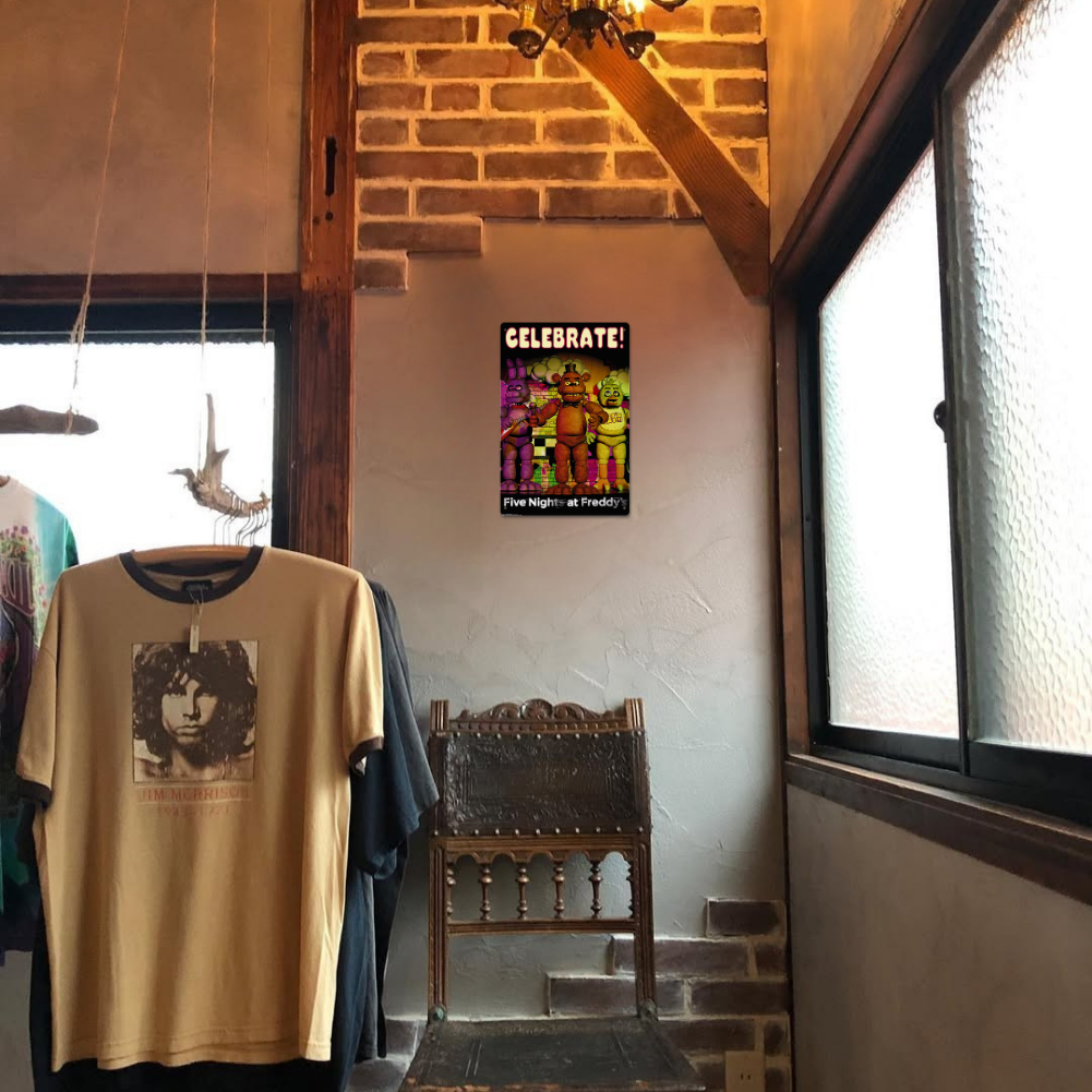 Add some jump-scare charm to your space with the classic Five Nights at Freddy’s “Celebrate!” artwork on a sturdy tin sign. It’s a fun, nostalgic nod to the animatronic crew—and a perfect conversation starter.