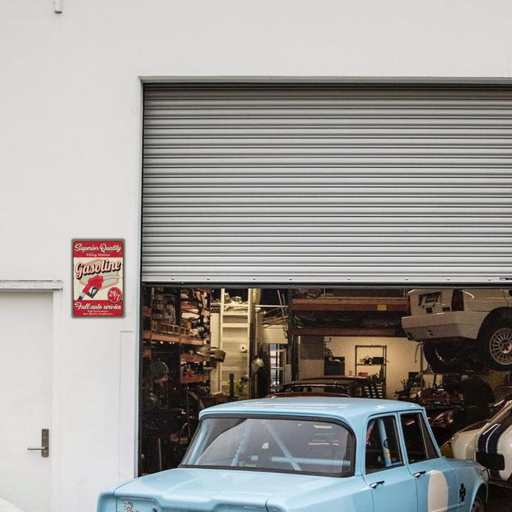 Turn any wall into a classic service bay with this vintage-style Gasoline Filling Station 24/7 tin sign. Bold reds, creamy off-white, and a weathered patina deliver instant retro charm.
