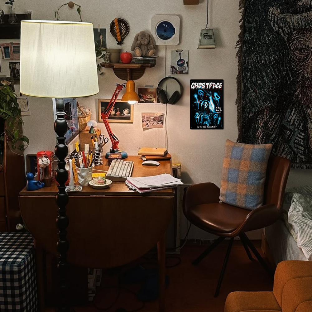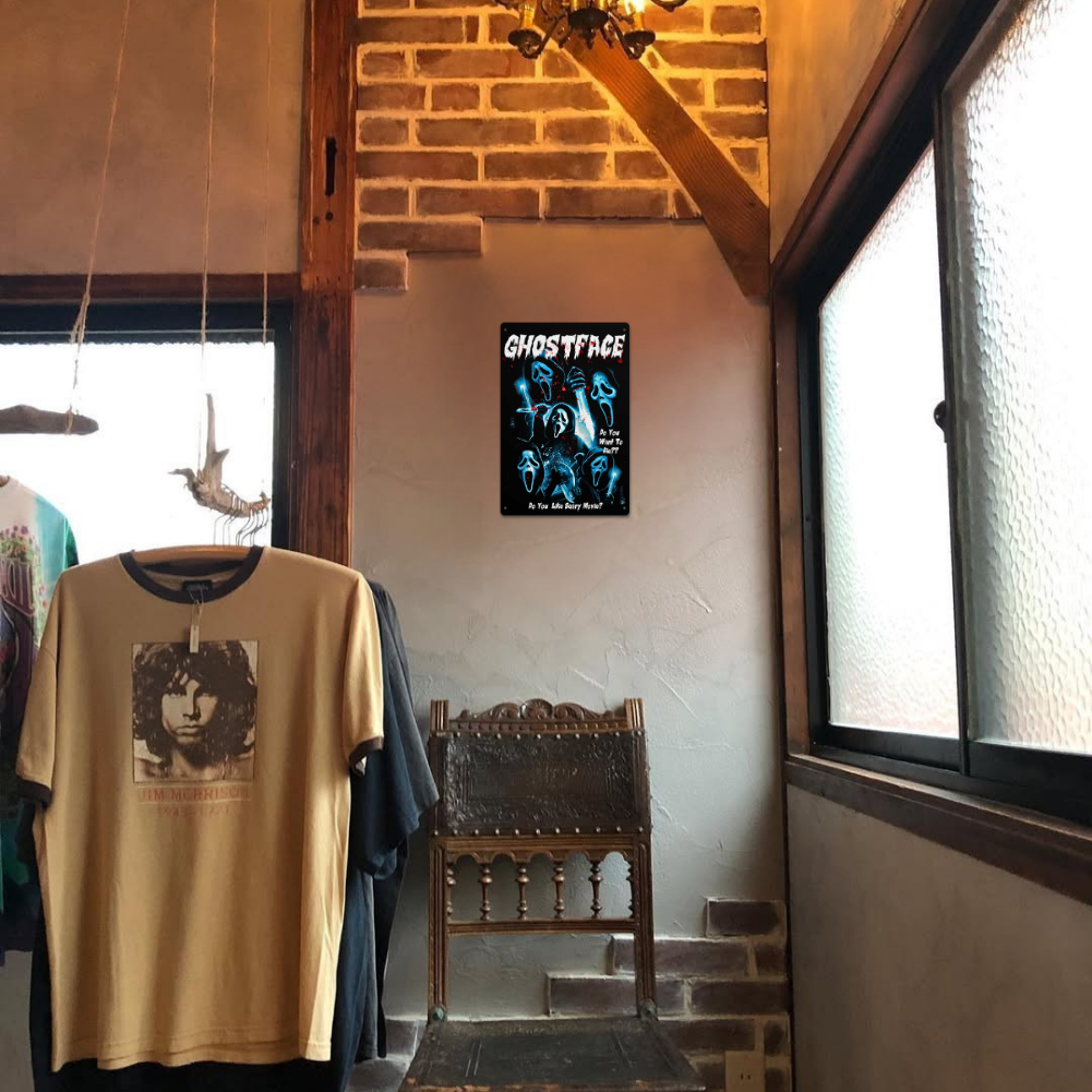Answer the phone if you dare. This bold tin sign features Ghostface in icy blue tones with blood-red splatter and the infamous lines from Scream. It’s a killer way to set the mood for movie night.