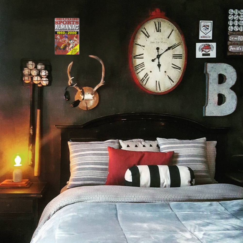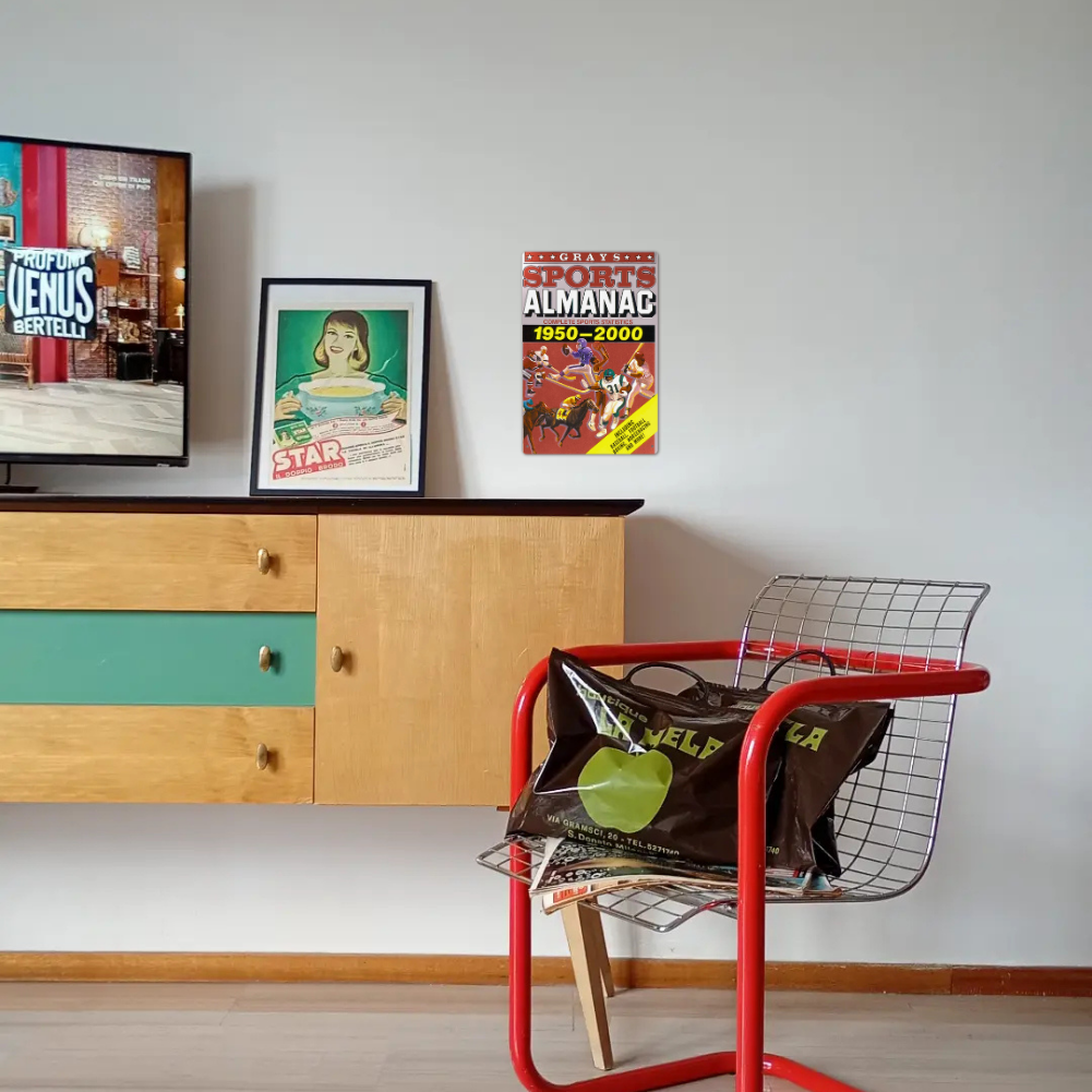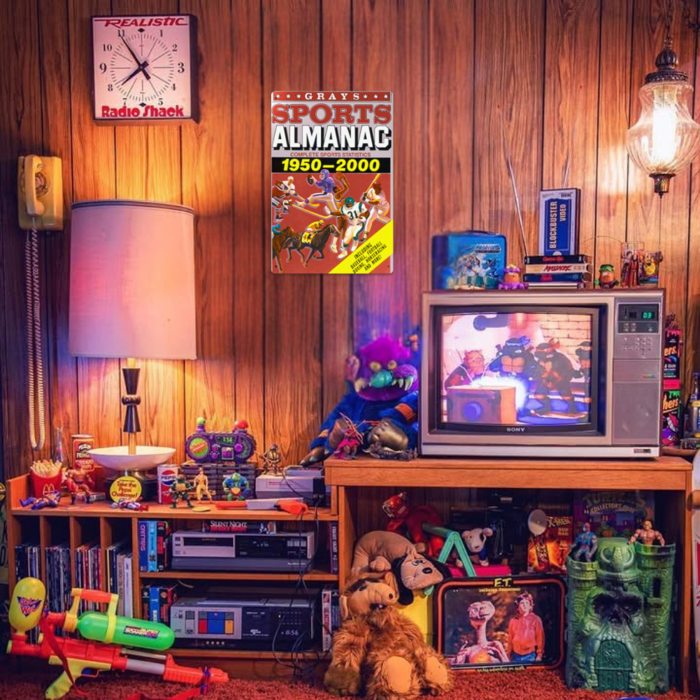 Channel that time-travel trivia energy. This wall print recreates the iconic Grays Sports Almanac 1950–2000 cover—chunky headline type, action-packed athlete collage, and the bold yellow corner ribbon.