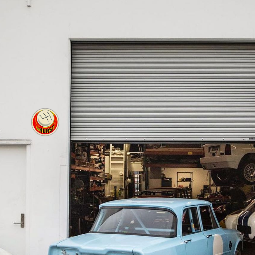 Celebrate stick-shift culture with this round Hurst Competition/Plus metal sign, featuring the classic 4-speed shift pattern in bold red, yellow, and white.