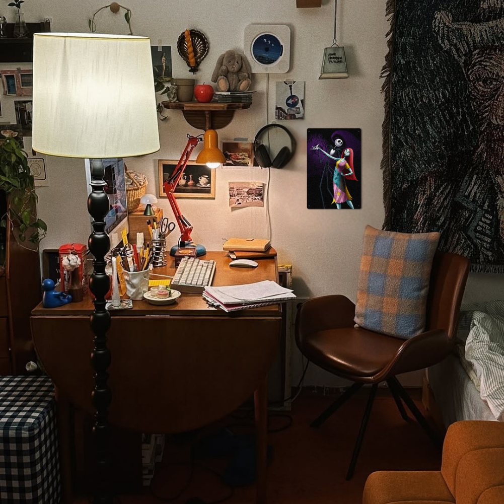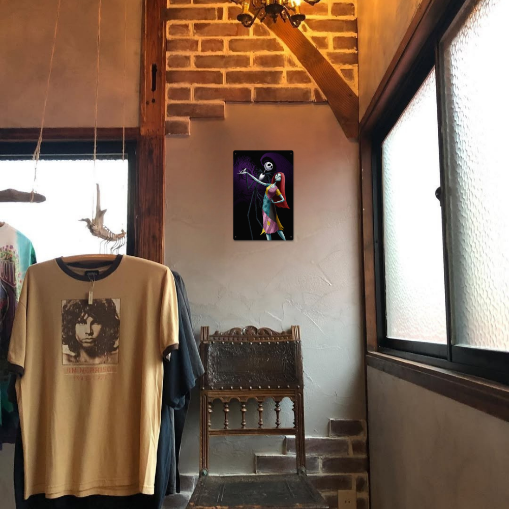Add a touch of Tim Burton magic to your walls with this charming tin sign featuring Jack Skellington and Sally mid-dance.