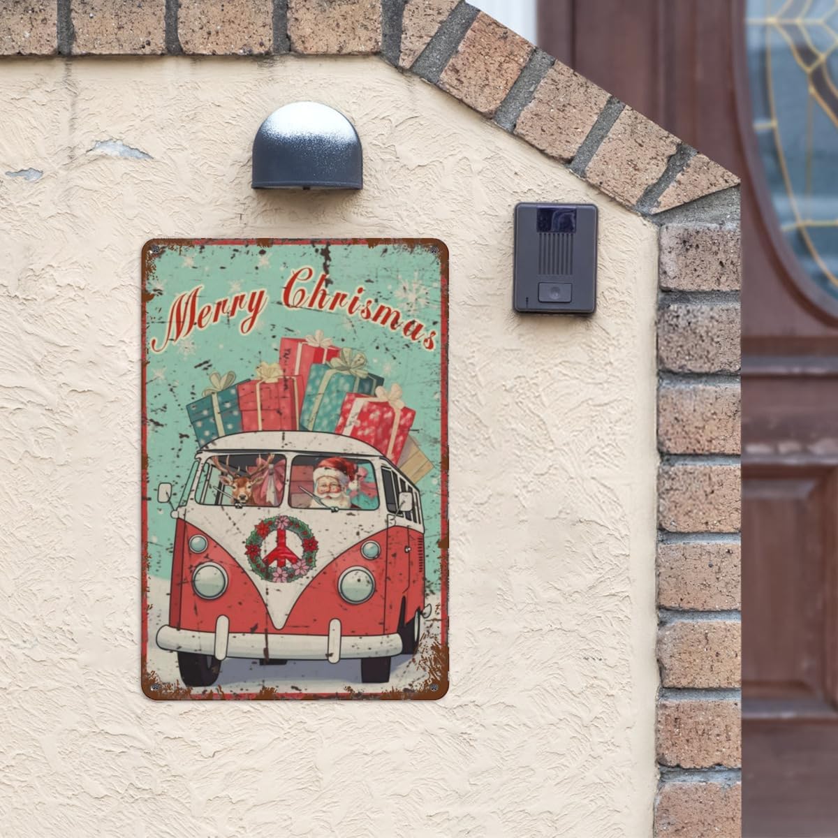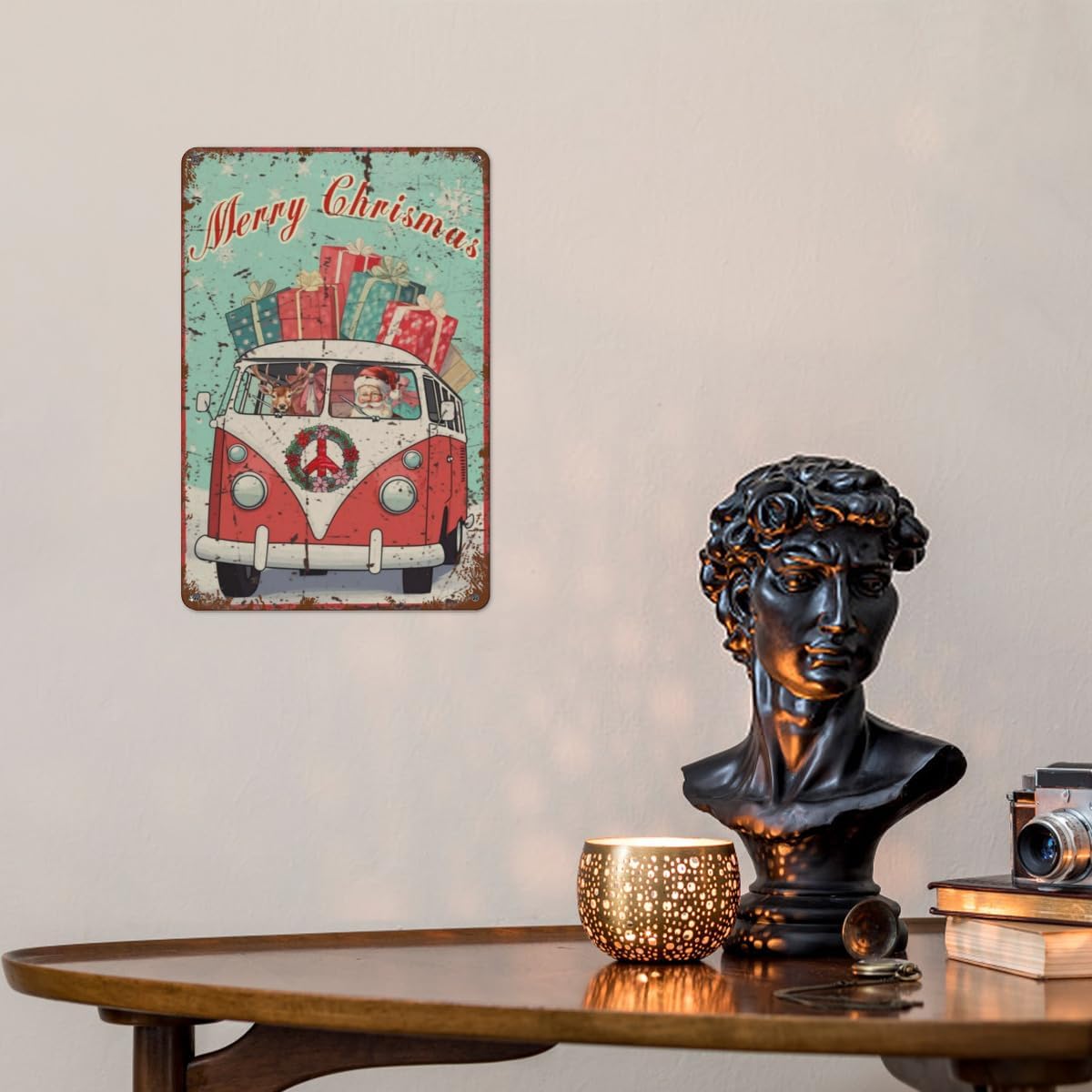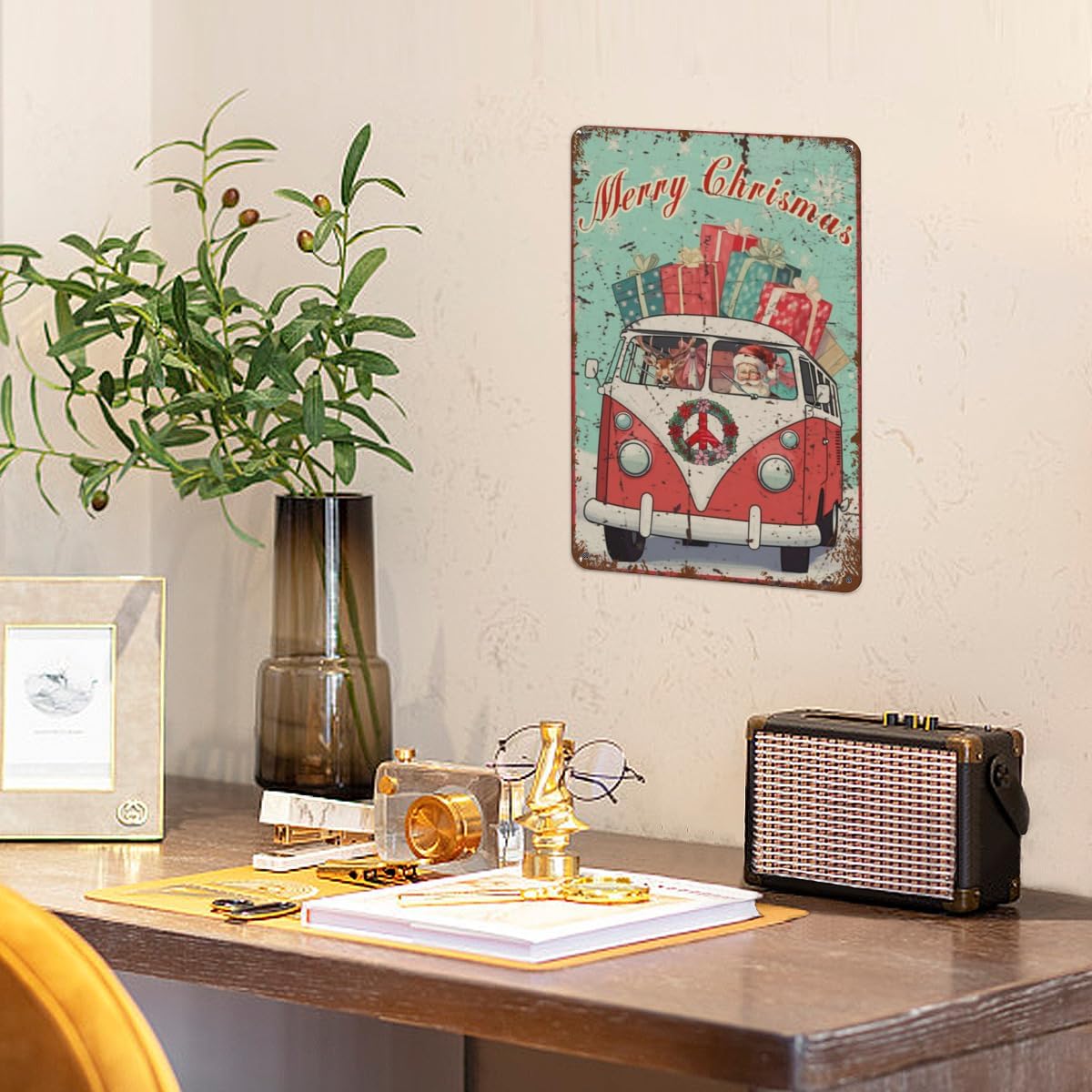 Get ready for a far-out holiday season with this groovy "Merry Christmas" tin sign! A fun and whimsical twist on a classic holiday scene, this sign features Santa and his trusty reindeer ditching the sleigh for a vintage VW bus to deliver peace, love, and presents.