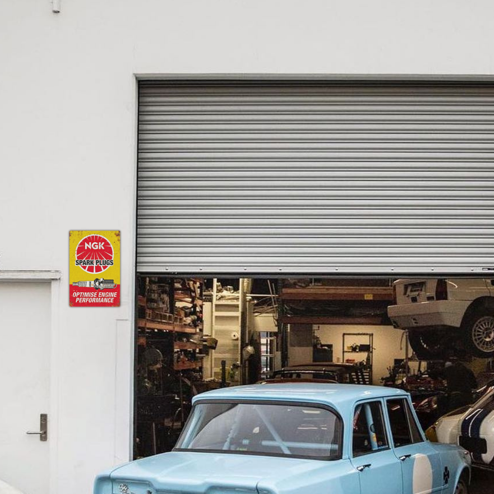 Turn your wall into a classic pit stop. This vintage-inspired NGK Spark Plugs tin sign features bold red-yellow graphics and a weathered finish for authentic garage style.
