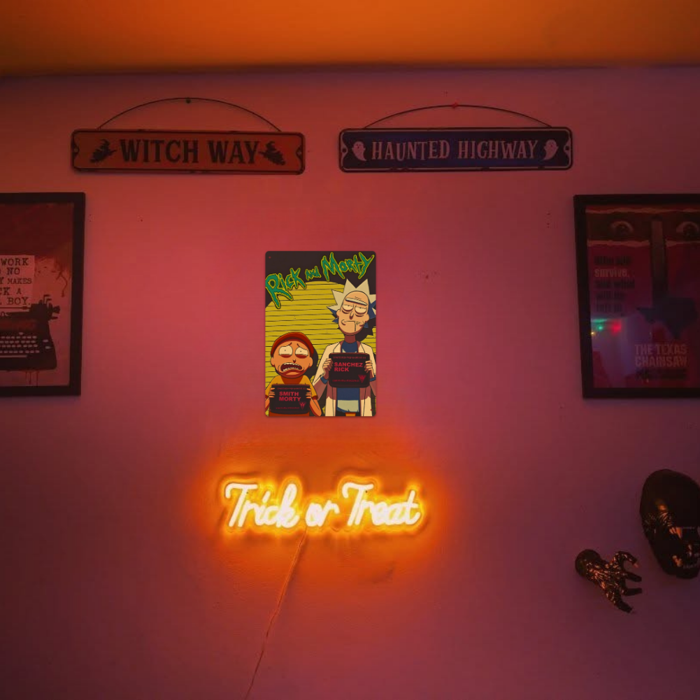 Portal-fueled trouble, caught on camera. This Tin Sign throws Rick Sanchez and Morty Smith into a mugshot lineup—neon logo overhead, expression mismatch on full display, and just enough chaos to make any wall feel a little more… interdimensional.