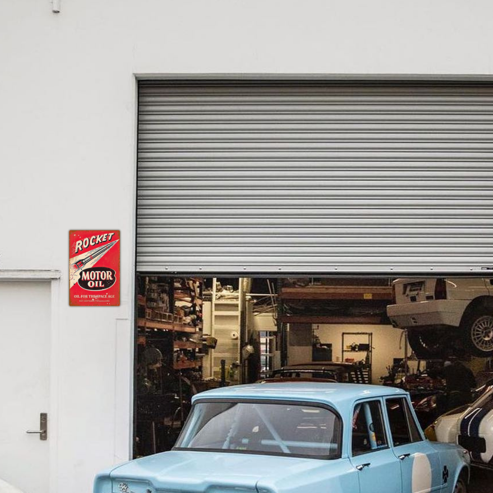 Launch your décor into orbit with this bold Rocket Motor Oil tin sign. Vintage red-and-cream artwork and a weathered finish deliver true Space Age vibes.