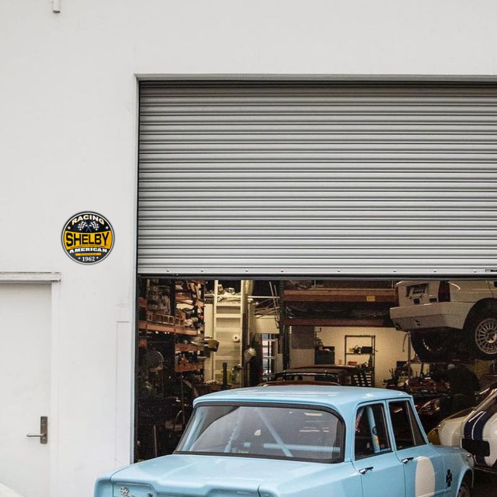 Celebrate motorsport heritage with this round Shelby American Racing metal sign, featuring crossed flags and the classic “Established 1962” badge in bold black and gold.