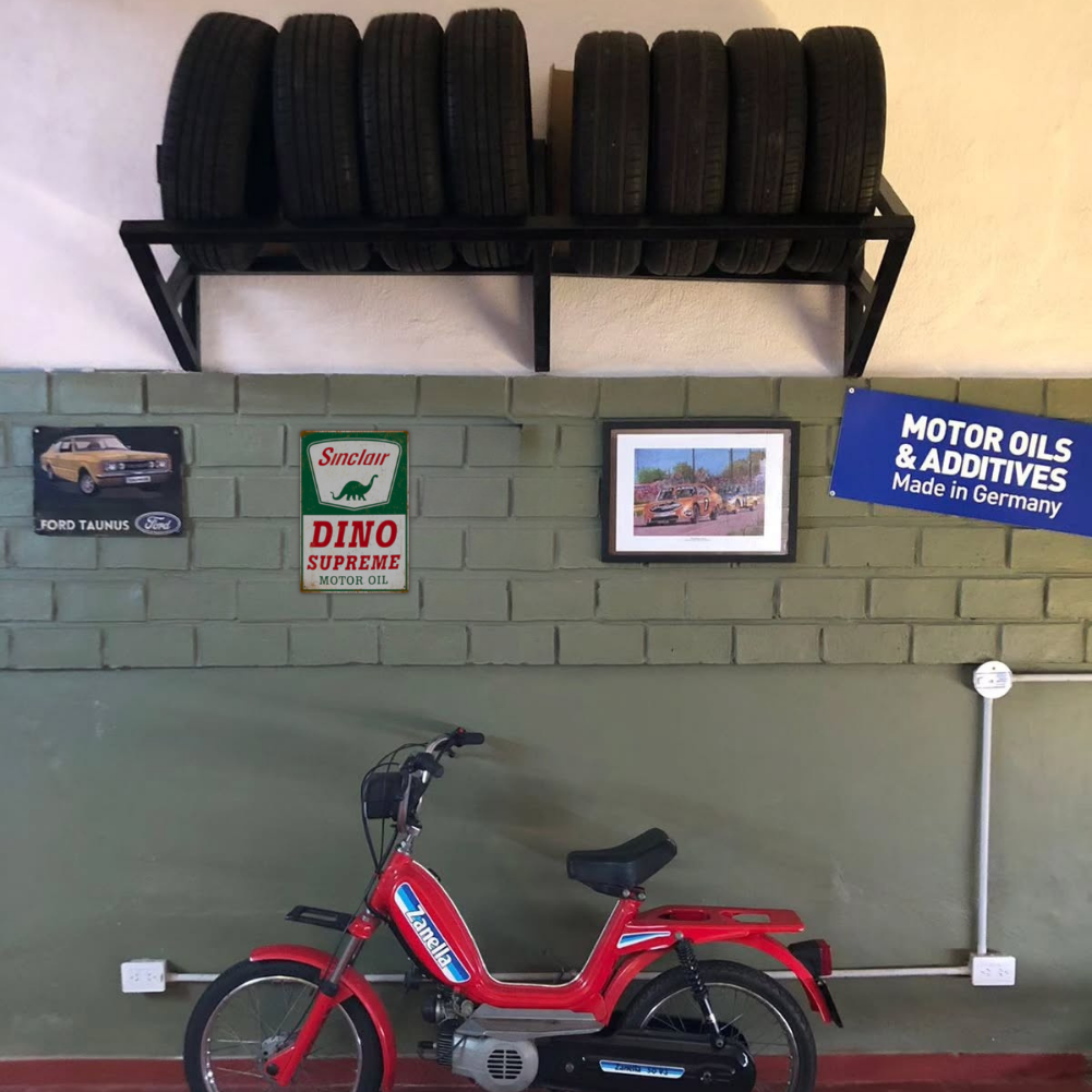 Bring retro service-station vibes home with this officially styled Sinclair “Dino Supreme” tin sign. Bold greens and reds, weathered edges, and the iconic dinosaur make it a must for gas & oil collectors.