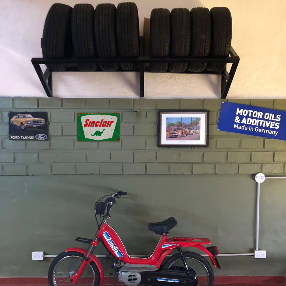 Add classic service-station charm to your space with this Sinclair Dino vintage-style tin sign. The weathered look brings instant character to any wall.