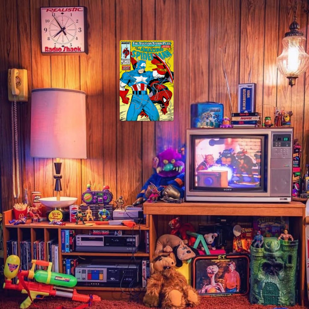 Two legends, one explosive cover. This poster recreates Todd McFarlane’s Amazing Spider-Man #323 from the “Assassin Nation Plot,” pairing Captain America with Spider-Man against a striking yellow field and slashing web lines. A punchy, vintage-comic statement for any Marvel fan cave or studio.