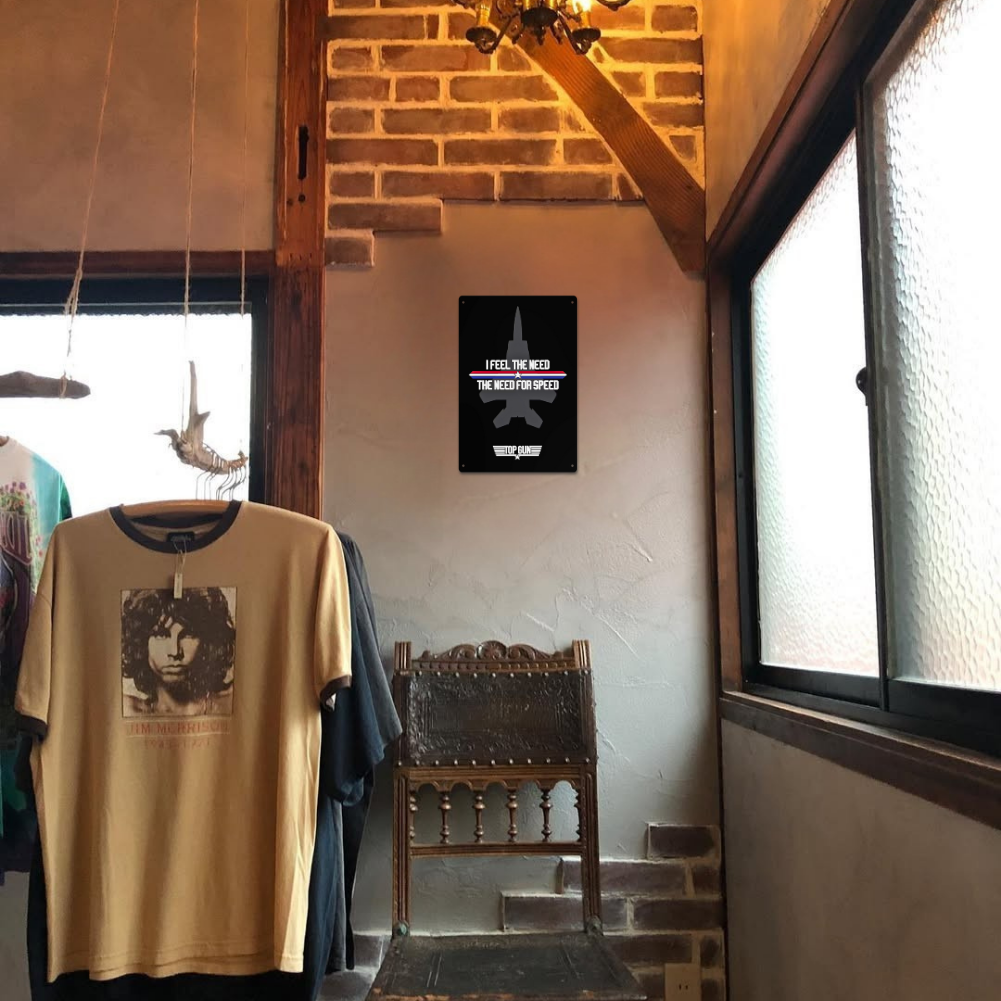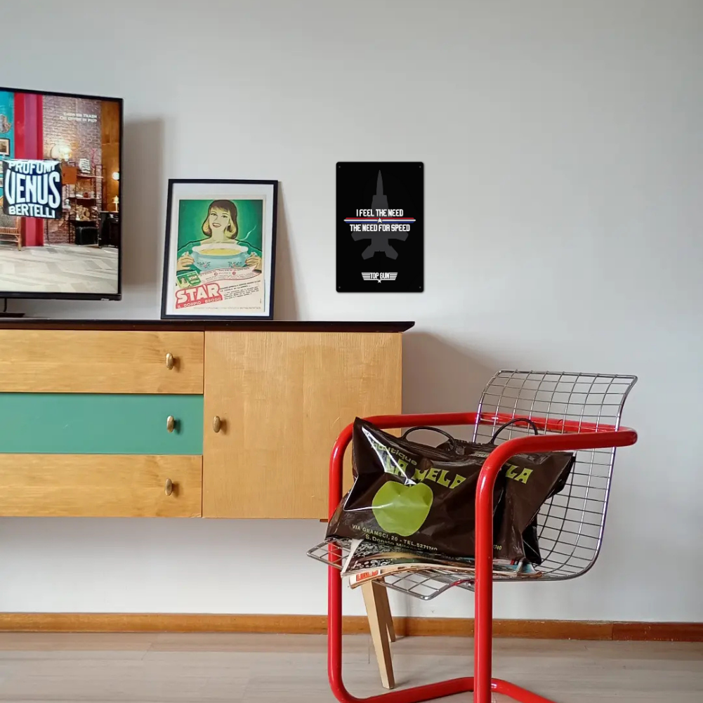 Channel your inner Maverick with this bold Top Gun tin sign featuring the iconic line, “I feel the need—the need for speed.” A clean jet silhouette and classic red-white-blue stripe make it a standout on any wall.