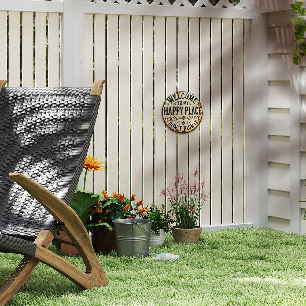 Set the tone the moment guests arrive. This round metal sign features a vintage cream-and-charcoal design that reads “Welcome to My Happy Place — Don’t Ruin It.” Printed patina adds retro charm without the mess.