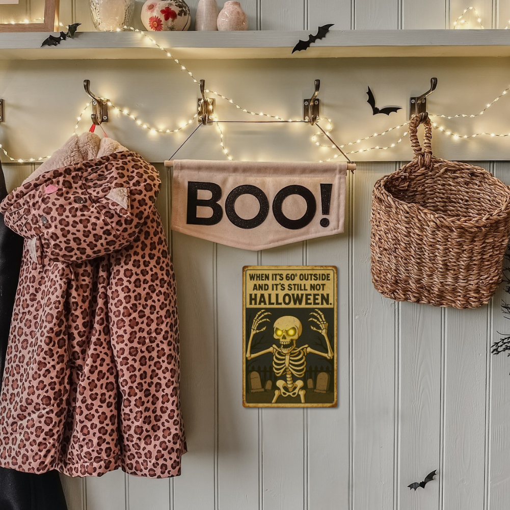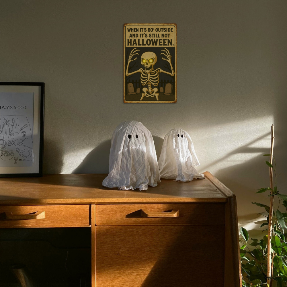 Too chilly for summer, too early for screams. This retro poster features a glowing-eyed skeleton rising in a graveyard scene with a tongue-in-cheek headline that captures every fall fan’s impatience. A distressed texture and warm parchment tones give it authentic vintage sign vibes—perfect for entryways, game rooms, or your Halloween gallery wall.