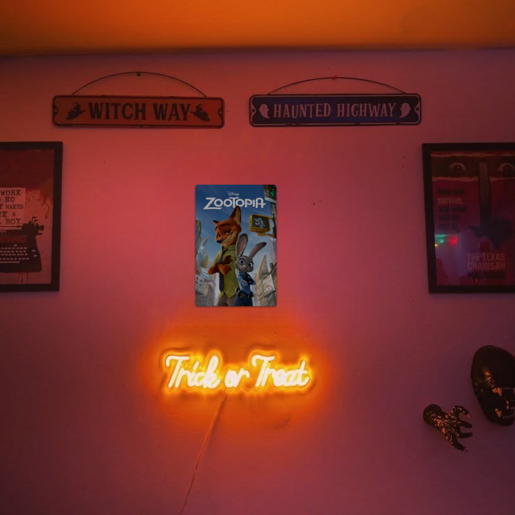 Channel the heart of Zootopia—optimism, hustle, and “anyone can be anything.” This Tin Sign brings the film’s one-sheet moment to your wall, pairing Judy’s fearless drive with Nick’s sly charm against a skyline that buzzes with possibility.